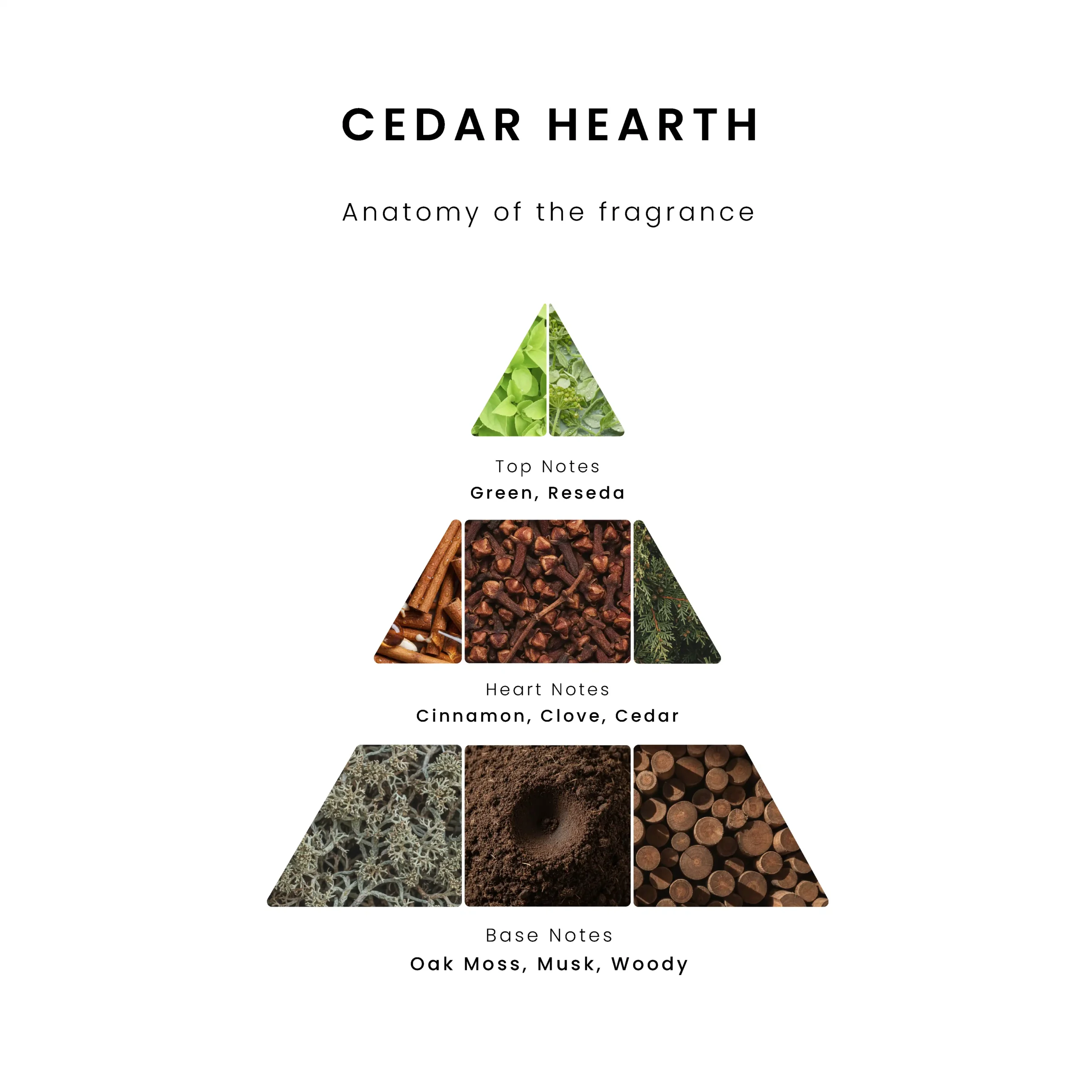 Wrap your home in the warmth of Cedar Hearth. This fragrance focuses on the comforting, dry heat of a fireplace. It opens with crisp green notes before diving into a spicy, nostalgic heart of cinnamon, clove, and aromatic cedarwood. With a deep base of oak moss and musk, it creates an atmosphere of timeless comfort and rugged luxury—ideal for evening relaxation.